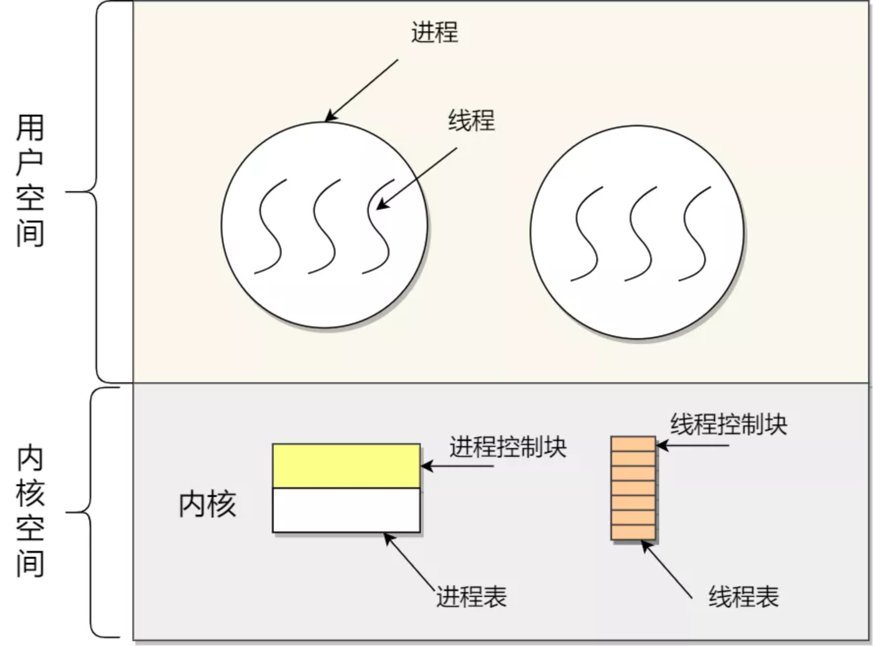内核线程是由操作系统管理的,线程对应的 TCB 是放在操作系统里的,这样线程的创建、终止和管理都是有操作系统来负载。