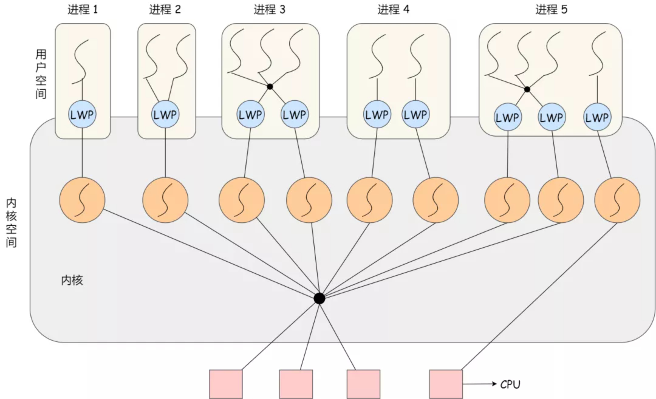 轻量级进程(Light-weight process,LWP)是内核支持的用户线程,一个进程可以有一个或多个 LWP,每个 LWP 是跟内核线程一对一映射的,也就说 LWP 都是由一个内核线程支持。