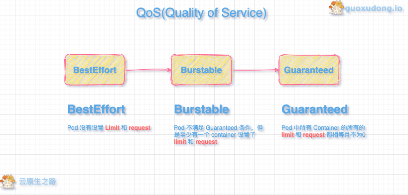 QoS(Quality of Service) 即服务质量,是 Kubernetes 中的一种控制机制,其会对运行在 Kubernetes 中的 Pod 进行一个质量划分,根据 Pod 中 container 的 Limit 和 request 将 Pod 分为 Guaranteed,Burstable,BestEffort 三类并对所有 Pod 进行一个打分。在资源尤其是内存这种不可压缩资源不够时,为保证整体质量的稳定,Kubernetes 就会根据 QoS 的不同优先级,对 Pod 进行资源回收。这也是有时集群中的 Pod 突然被 kill 掉的原因。